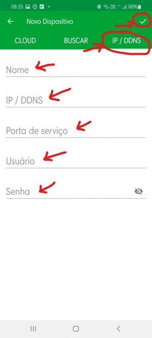 - No campo IP/DDNS digite as informações do endereço do DVR (ex.: trabalho.ddns.algumacoisa.info)